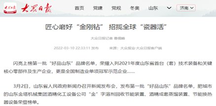 榮耀閃閃,品牌彰顯。 近日,2022年山東省優(yōu)質(zhì)品牌榜單揭曉。山東金塔機(jī)械集團(tuán)“廢液蒸發(fā)成套裝備”、“用于熱敏性物料的蒸發(fā)裝置”榮耀上榜。至此,自2019年榜單發(fā)布以來,金塔集團(tuán)共有10項(xiàng)產(chǎn)品榮獲山東優(yōu)質(zhì)品牌稱號(hào)。 山東金塔集團(tuán)守正創(chuàng)新強(qiáng)主業(yè),精耕細(xì)作鑄品牌,突出以科技創(chuàng)新強(qiáng)化品牌支撐,年年出成果,歲歲有專利,新工藝、新技術(shù)、新產(chǎn)品拓寬了市場(chǎng)新領(lǐng)域。作為《酒精蒸餾塔》、《糠醛水解鍋》、《糠醛蒸餾塔》等20余項(xiàng)國家行業(yè)標(biāo)準(zhǔn)的制定者,金塔集團(tuán)聚焦雙碳目標(biāo),把控綠色節(jié)能方向,牢牢占據(jù)行業(yè)制高點(diǎn),贏得了市場(chǎng)話語權(quán)。通過深入實(shí)施品牌戰(zhàn)略,致力打造自主品牌,金塔產(chǎn)品質(zhì)量?jī)?yōu)、品質(zhì)好、標(biāo)準(zhǔn)化的綜合優(yōu)勢(shì)得到全方位厚植。 金塔品牌靚,展示好形象。“金”字及圖商標(biāo),中國馳名商標(biāo);首批“好品山東”,金塔榮耀其中;山東優(yōu)質(zhì)品牌,連年完美上榜…金塔在出新中更加出彩,品牌在打造中愈加閃亮。 品牌閃爍,金塔增色。以品牌樹形象,以品牌闖市場(chǎng),金塔品牌之路越走越寬廣,為助推企業(yè)高質(zhì)量發(fā)展注入了強(qiáng)大動(dòng)能。